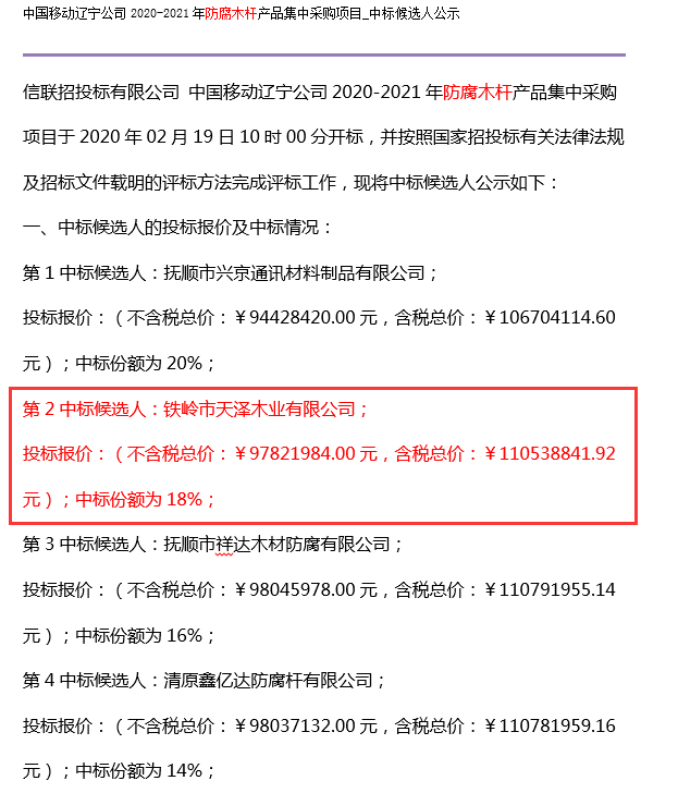 天澤木業在中國移動遼寧公司最新防腐木桿采購項目中中標